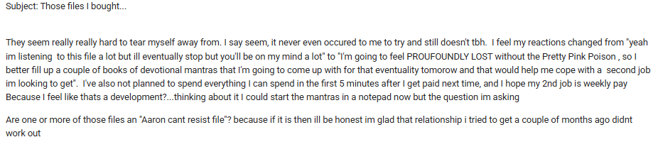 “Its aaron, I’ve been paid a little early this month AND ive managed to find a loan . Not much, but baring in mind I defaulted everything to prove my love I deleted all my recordings but it turns out apple backs up everything and I’m sooo glad as I cant stop, so why try to stop”